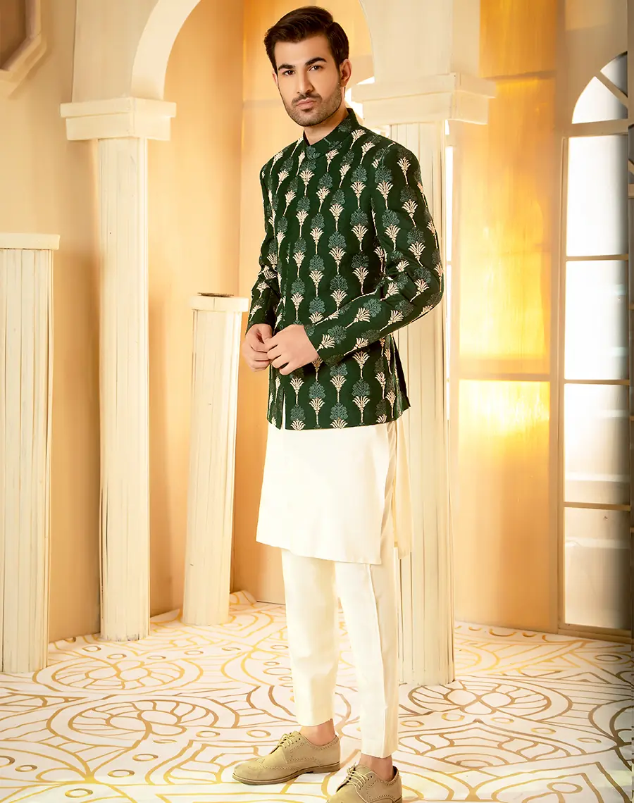 Description | "This elegant green coat, adorned with exquisite hand-embellished work, showcases exceptional craftsmanship, rendering it a truly unique and sophisticated masterpiece." | The suit's versatility allows it to be styled in various ways, from classic and timeless to modern and edgy | Our Mandarin coat in rich rust brown showcases exceptional craftsmanship with hand-embellished work in different colors. | Our Prince Coat in rich red features exquisite hand-embellished work with Dabka & Moti, paired with sleek straight trouser pants. | A luxurious red sherwani with intricate gold embroidery, featuring a leaf print design and hand-embellished work. | "The sherwani appears to be made from a opulent black fabric intricate embroidered, which adds to its Skillfully patterned. The hand-embellished black work on it suggests a high level of craftsmanship, making it a One-of-a-kind piece. |