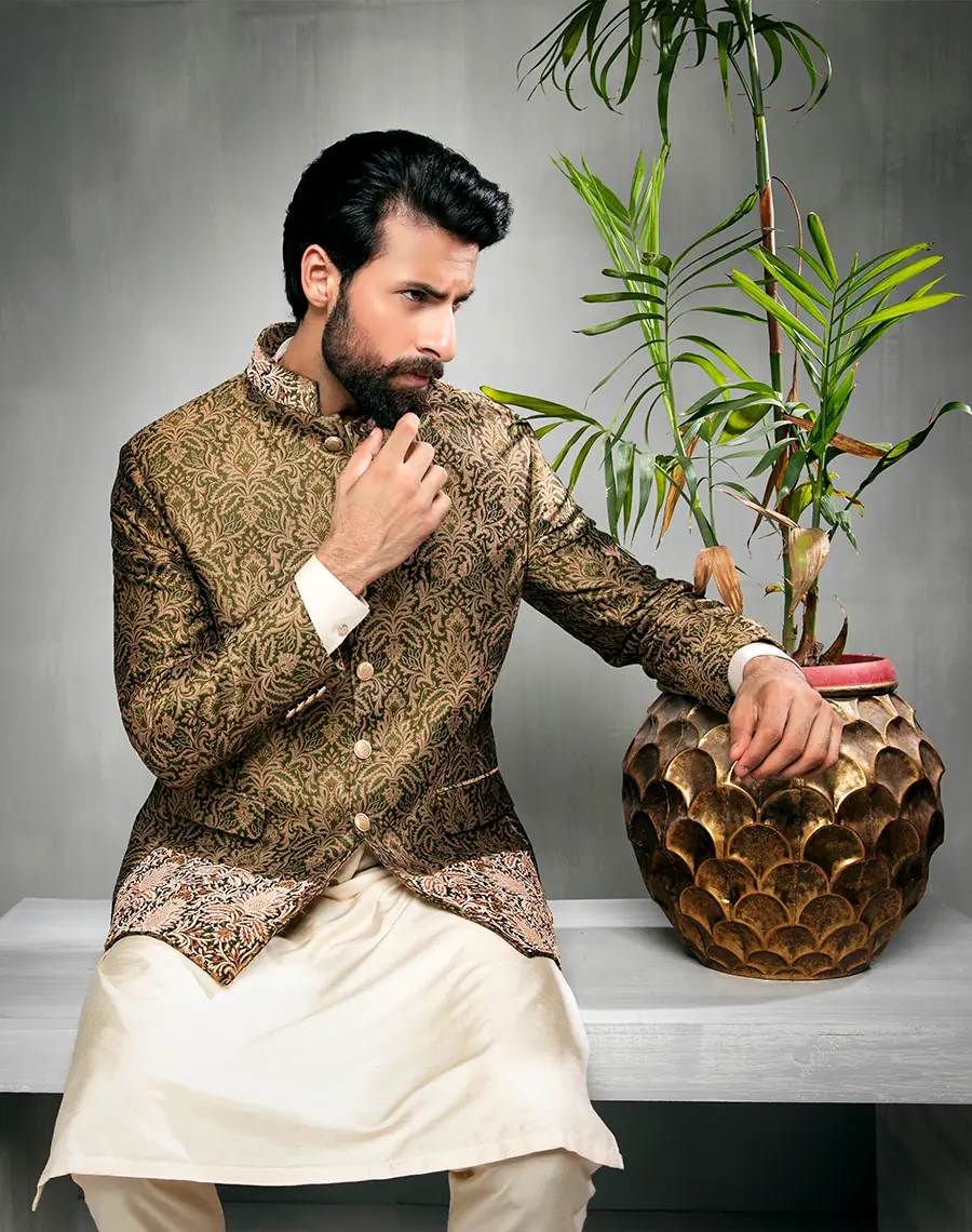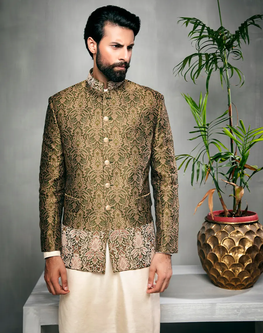 Description | "Adorned with intricate auric filigree, this emerald-hued Prince Coat manifests an aura of refined opulence." | A masterpiece of refinement our viridian dabka work waistcoat. The gold dabka threads shimmer and shine, creates embodiment of luxury. | "This exquisite green Prince Coat boasts intricate golden embellished handwork , meticulously Ornate into a stunning design." | The suit's tailored fit and smooth fabric ensure a comfortable and chic attire." | Our Mandarin coat in rich rust brown showcases exceptional craftsmanship with hand-embellished work in different colors. | "This elegant green coat, adorned with exquisite hand-embellished work, showcases exceptional craftsmanship, rendering it a truly unique and sophisticated masterpiece." |