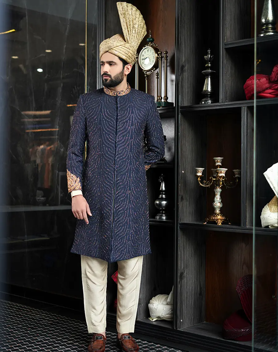 This luxurious blue sherwani, expertly crafted with intricate gold accents and luxurious fabric.