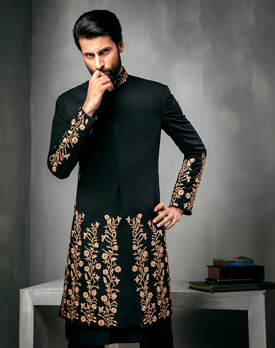 “This majestic black sherwani is lavishly adorned with intricate print embroidery in skin gold and rose hues, creating a regal silhouette that commands attention.”