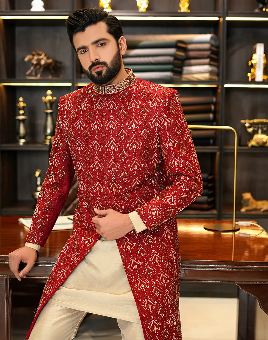 A luxurious red sherwani with intricate gold embroidery, featuring a leaf print design and hand-embellished work.