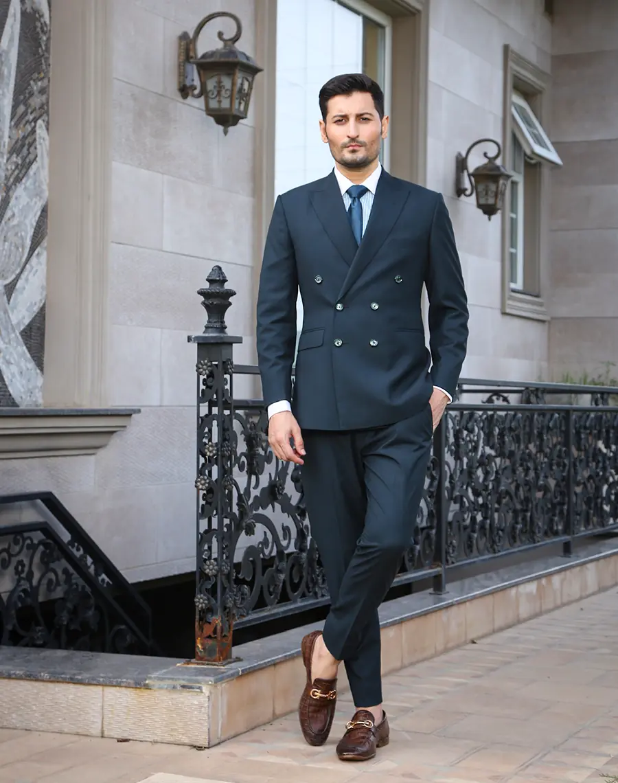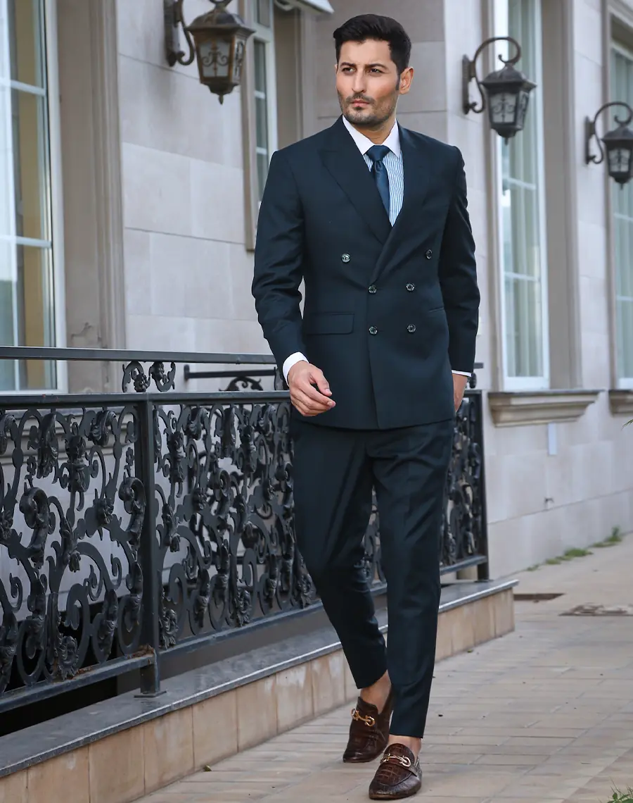 Our dark green double-breasted suit, a sartorial behemoth that commands respect and admiration.