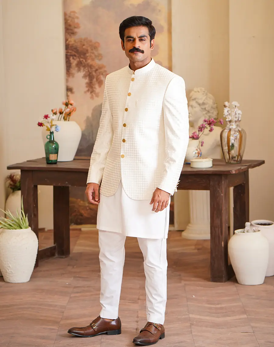 Description | Introducing our stunning Prince Coat, tailored to perfection in pristine white. Adorned with golden buttons that add a touch of luxury, this outfit is sure to make you feel like royalty. | Exuding opulence and vibrancy, our rust gold embroidered waistcoat is a masterpiece of sartorial craftsmanship | "Experience the epitome of elegance with our golden sherwani, meticulously hand-stitched with intricate maroon thread work | The royal black embroidered Prince Coat paired with a sleek black trouser kurta exudes grandeur and poise. The intricate gold embroidery adds a touch of majesty. Paired with matching shoes. | "Our blue sherwani boasts a captivating charm, thanks to its exquisite cream embroidered fabric. The intricate threadwork weaves a narrative of elegance." | "Effulgent sophistication emanates from our pristine white double-breasted waistcoat." |