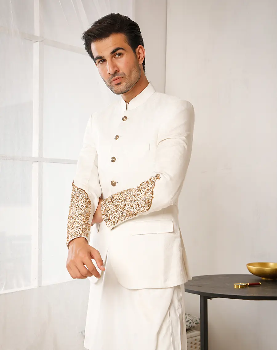 Description | "This elegant printed coat dress is elevated by intricate arm embellishments in golden and copper hues. The delicate prints create a beautiful pattern across the fabric, while the arm work adds a touch of Refinement." | "This waistcoat is poised to make a stylish impression at formal gatherings and special occasions." | "Experience the epitome of elegance with our golden sherwani, meticulously hand-stitched with intricate maroon thread work | Exuding opulence and vibrancy, our rust gold embroidered waistcoat is a masterpiece of sartorial craftsmanship | "The rich, deep red hue is perfectly complemented by intricate embroidery and exquisite Dabka work on the arms and collar, adding a touch of opulence to this premium garment." | "Regal majesty personified, our bespoke white gold sherwani is an exemplar of sartorial splendor, distinguished by its captivating charm and fastidious attention to detail." |