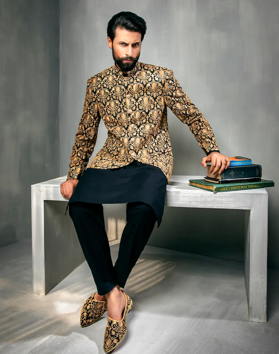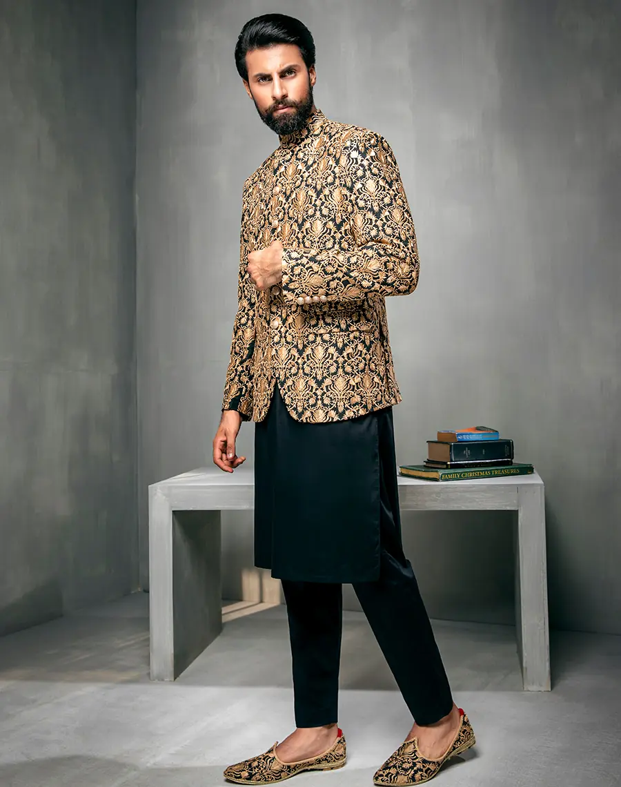 The royal black embroidered Prince Coat paired with a sleek black trouser kurta exudes grandeur and poise. The intricate gold embroidery adds a touch of majesty. Paired with matching shoes.