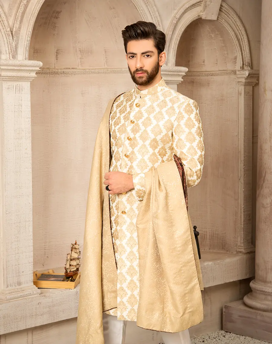 “Regal majesty personified, our bespoke white gold sherwani is an exemplar of sartorial splendor, distinguished by its captivating charm and fastidious attention to detail.”