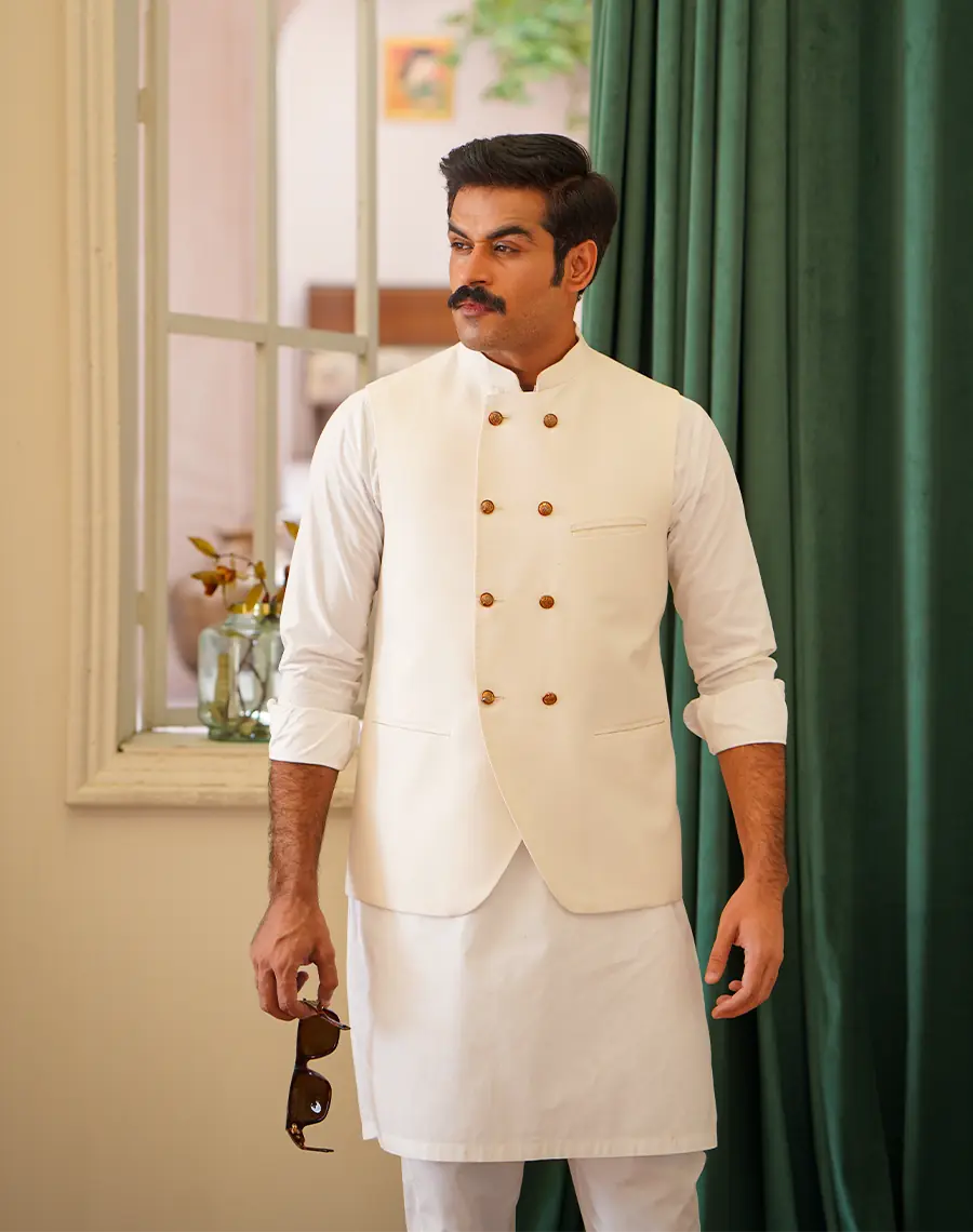 “Effulgent sophistication emanates from our pristine white double-breasted waistcoat.”