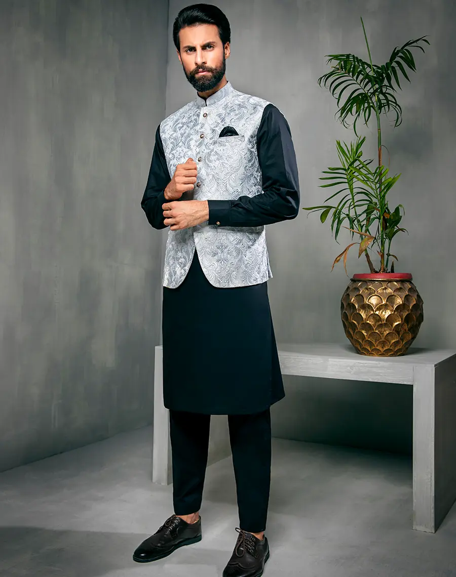 “Subdued yet sublime, our grey embroidered waistcoat exudes an aura of understated sophistication, distinguished by intricate threadwork and dark grey buttons that bespeak a nuanced attention to detail. The round corners imbue the garment with a subtle softness, while the embroidered motifs weave a narrative of refined elegance. A sartorial choice for the discerning gentleman, this waistcoat is poised to make a stylish impression at formal gatherings and special occasions.”