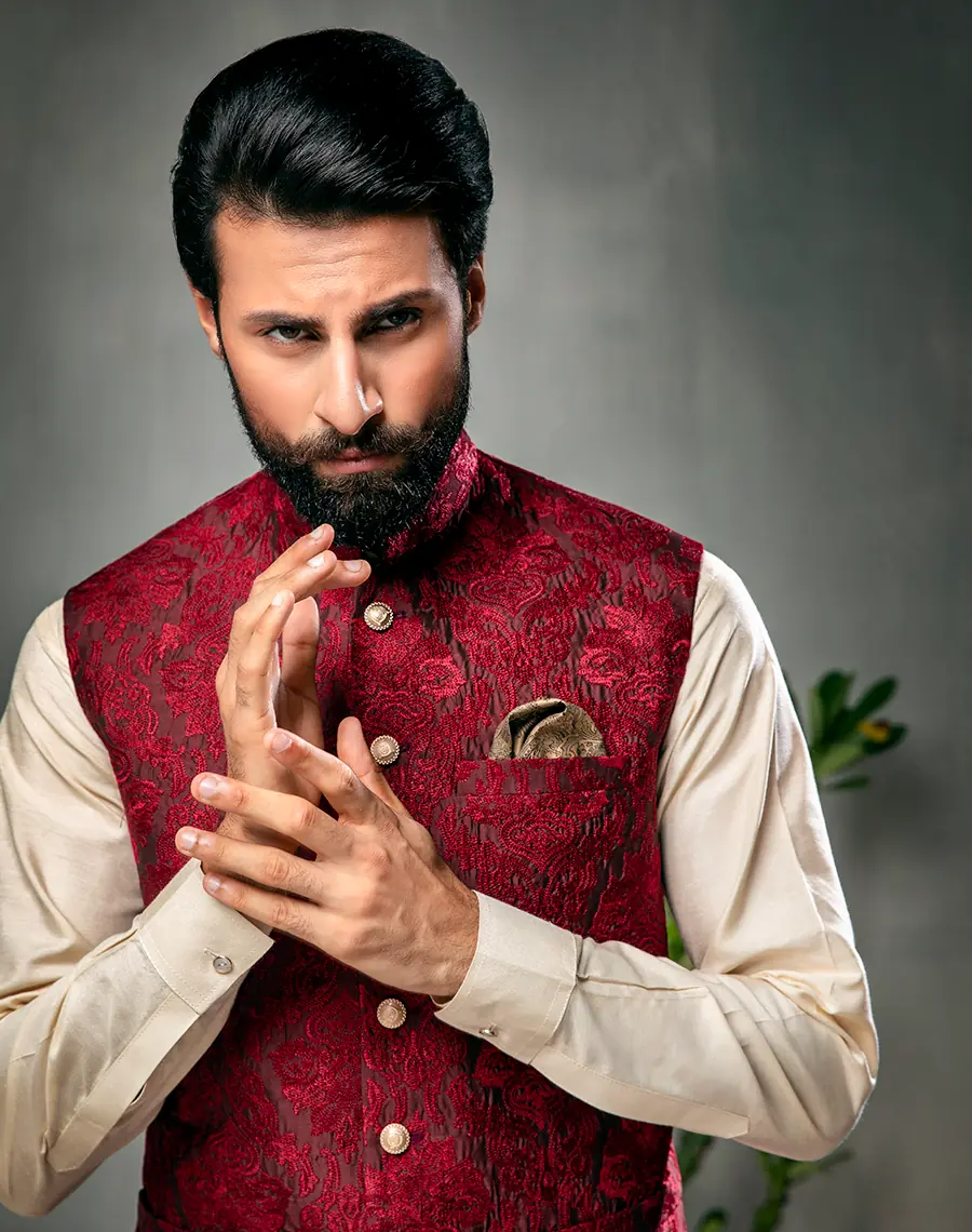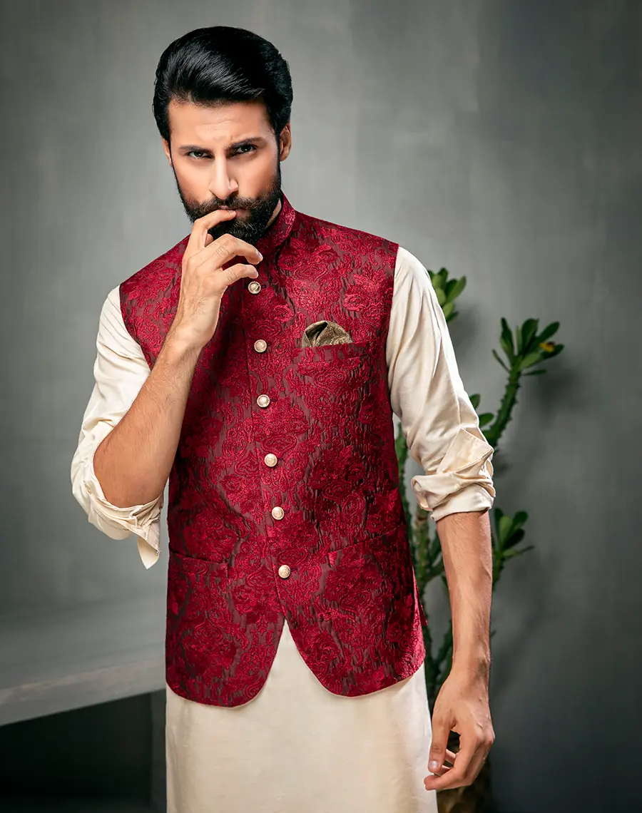 “Enveloped in an aura of restrained majesty, our maroon embroidered waistcoat manifests a symphony of subtle nuances, wherein the intricate filigree of threadwork converges with metallic