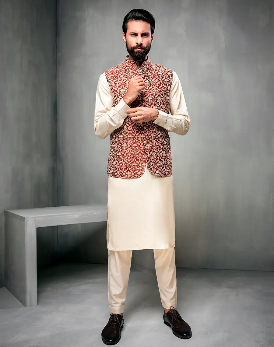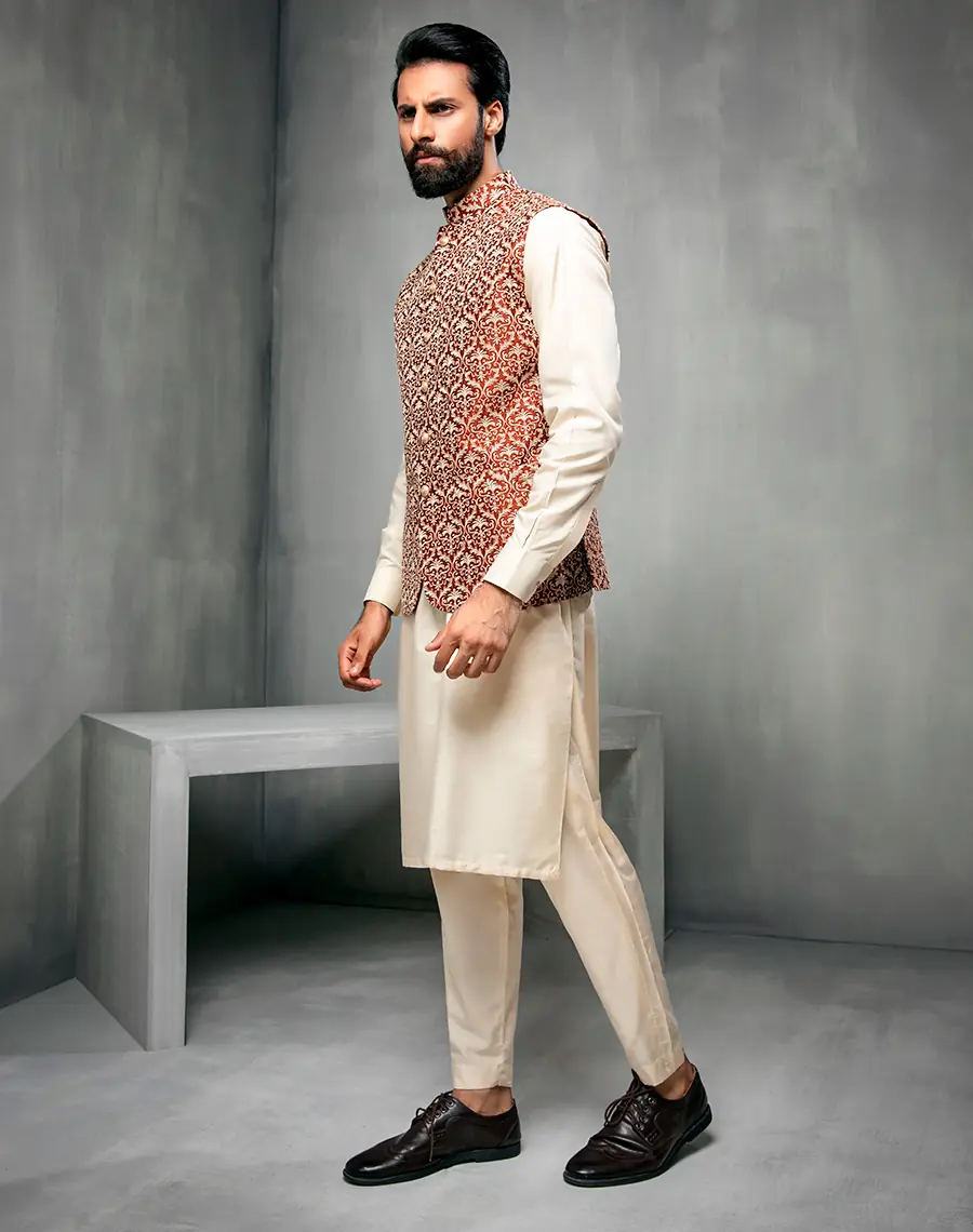Exuding opulence and vibrancy, our rust gold embroidered waistcoat is a masterpiece of sartorial craftsmanship